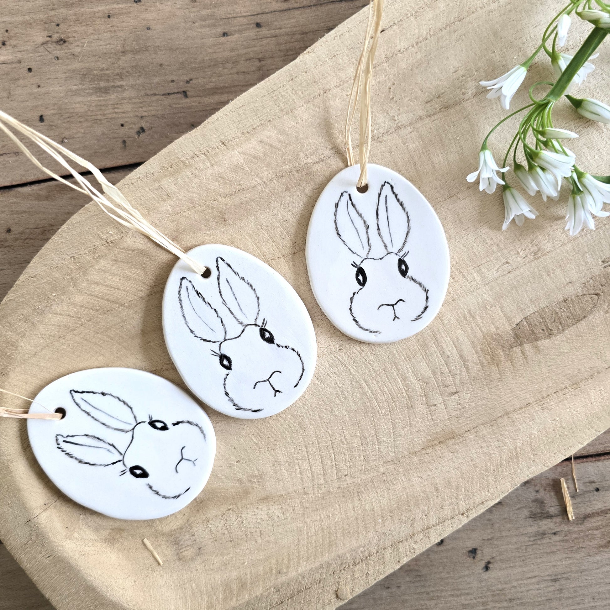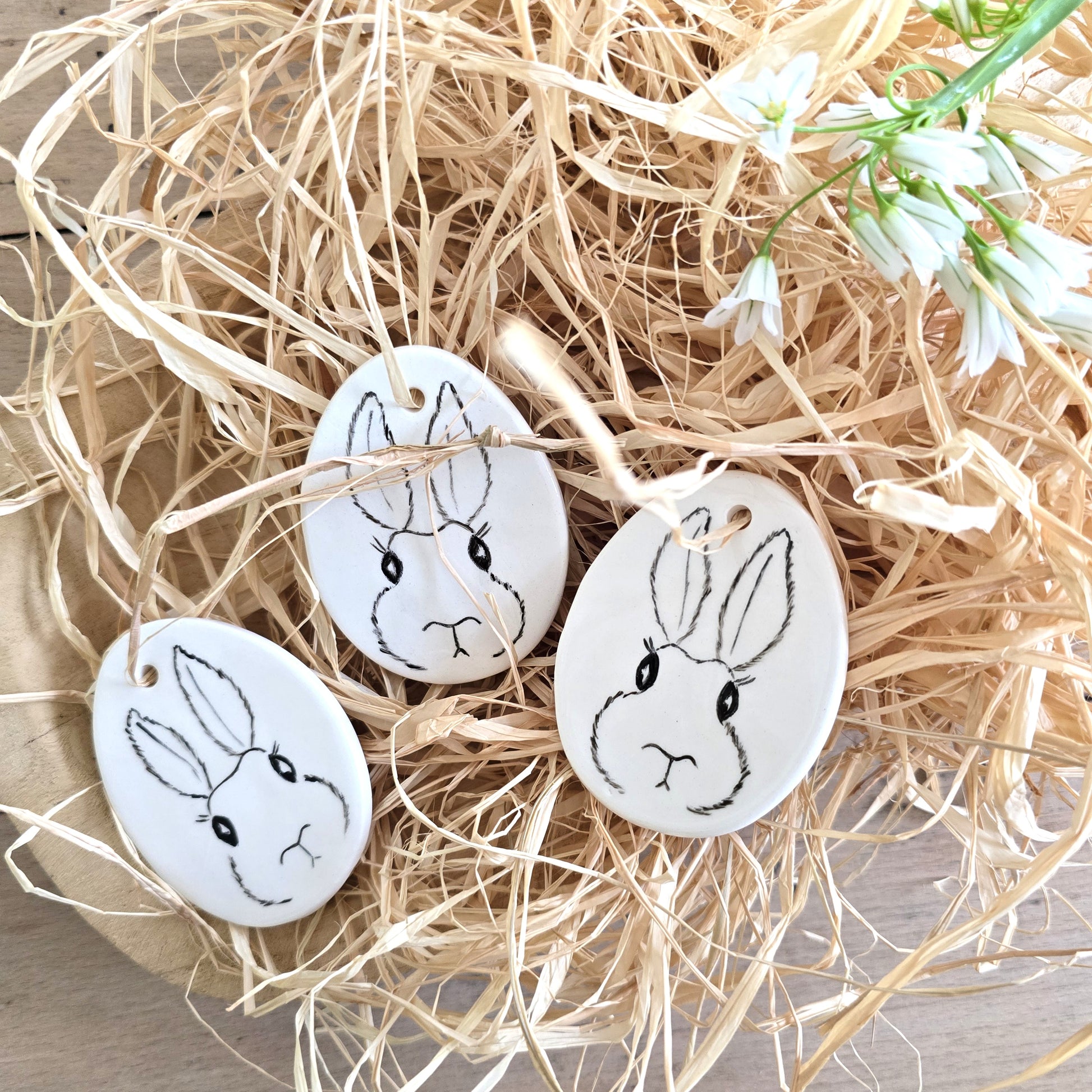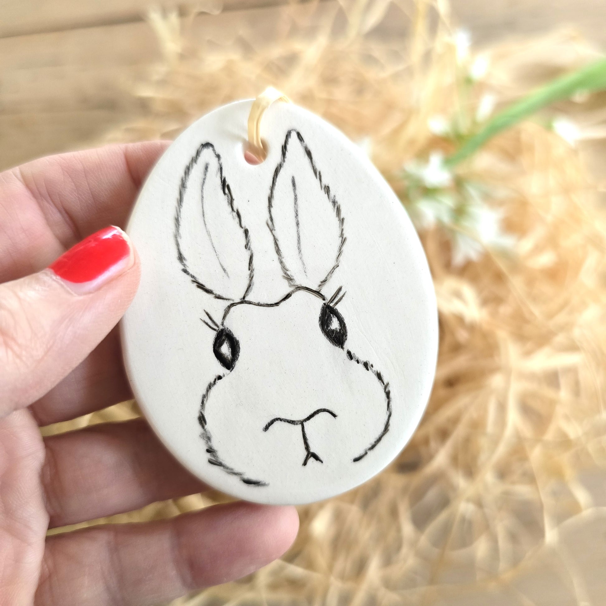 Célébrez le printemps avec élégance ! Ces ornements en céramique blanche entièrement réalisées à la main sont décorés d'un délicat portrait de lapin au trait fin et expressif.